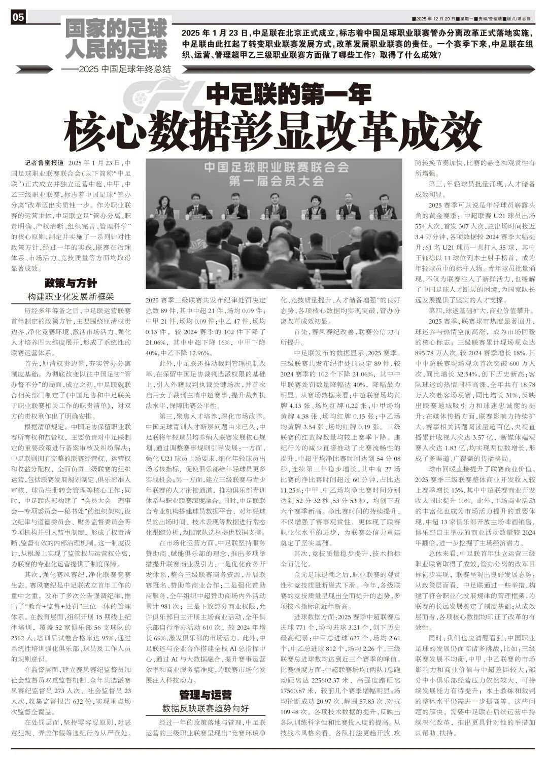 经过一年的政策落地与管理,中足联运营的三级职业联赛呈现出“竞赛环境净化、竞技质量提升、人才储备增强”的良好态势,各项核心数据均实现突破,管办分离改革成效初显。